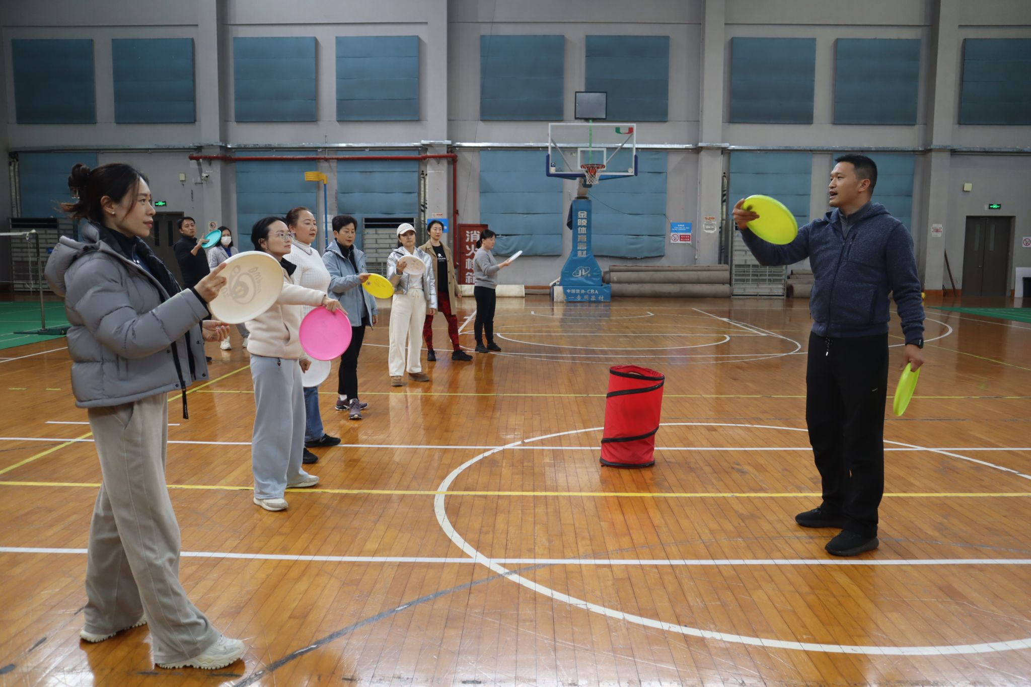 胡军琅老师(右一)为教师们讲解飞盘技术要点并进行示范