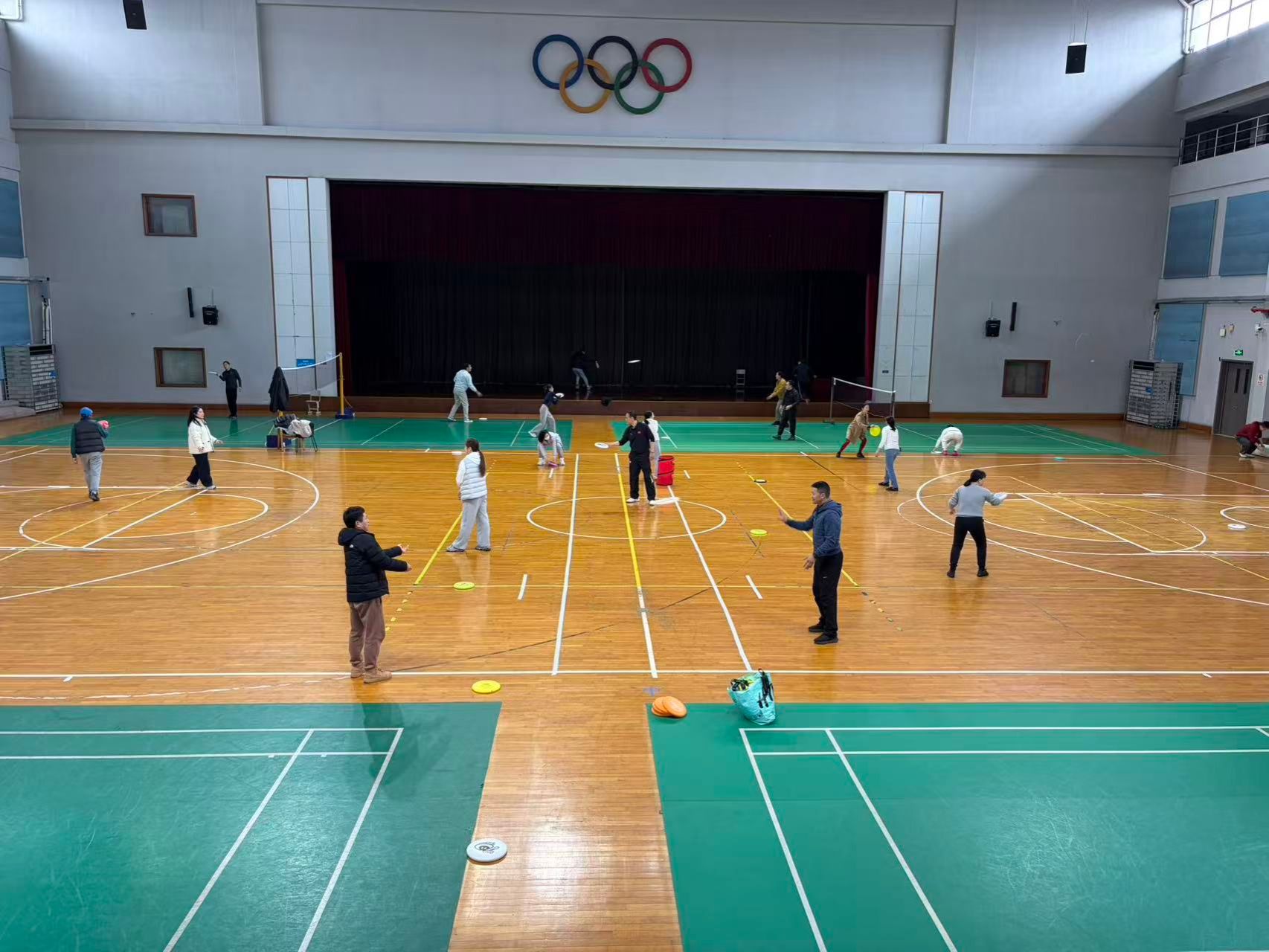 教师们正在分组进行飞盘传接配合练习